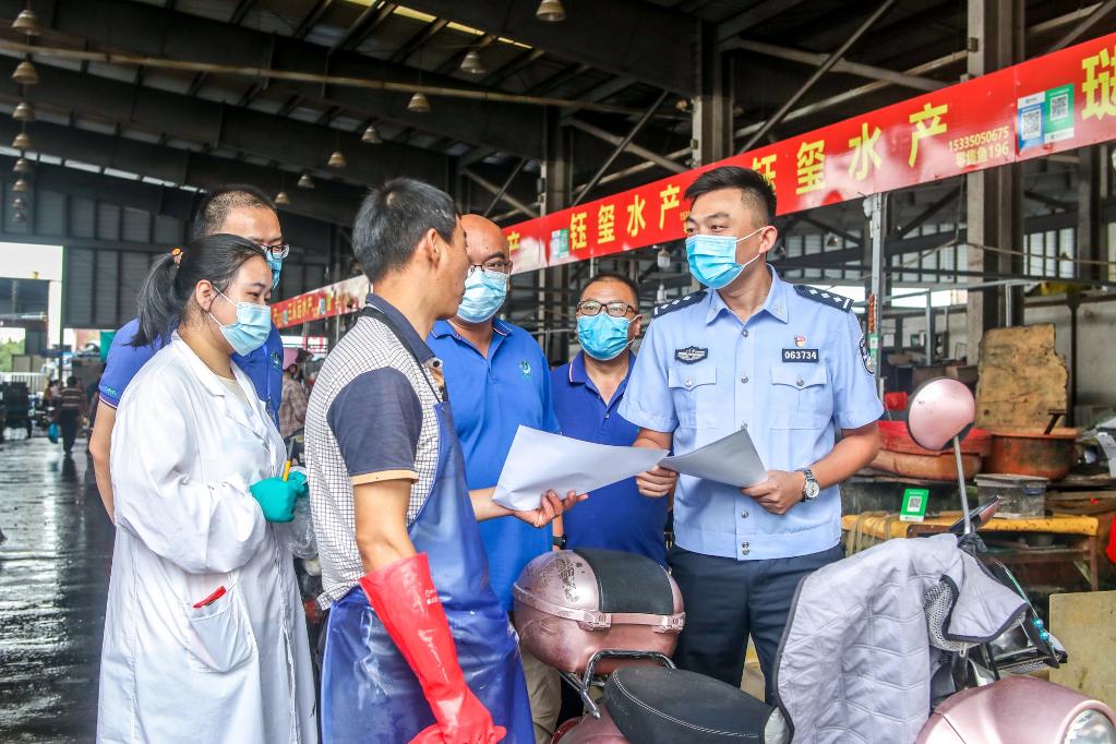公安機(jī)關(guān)會同相關(guān)部門開展聯(lián)合檢查,民警向商戶開展法律宣傳。(公安部供圖)