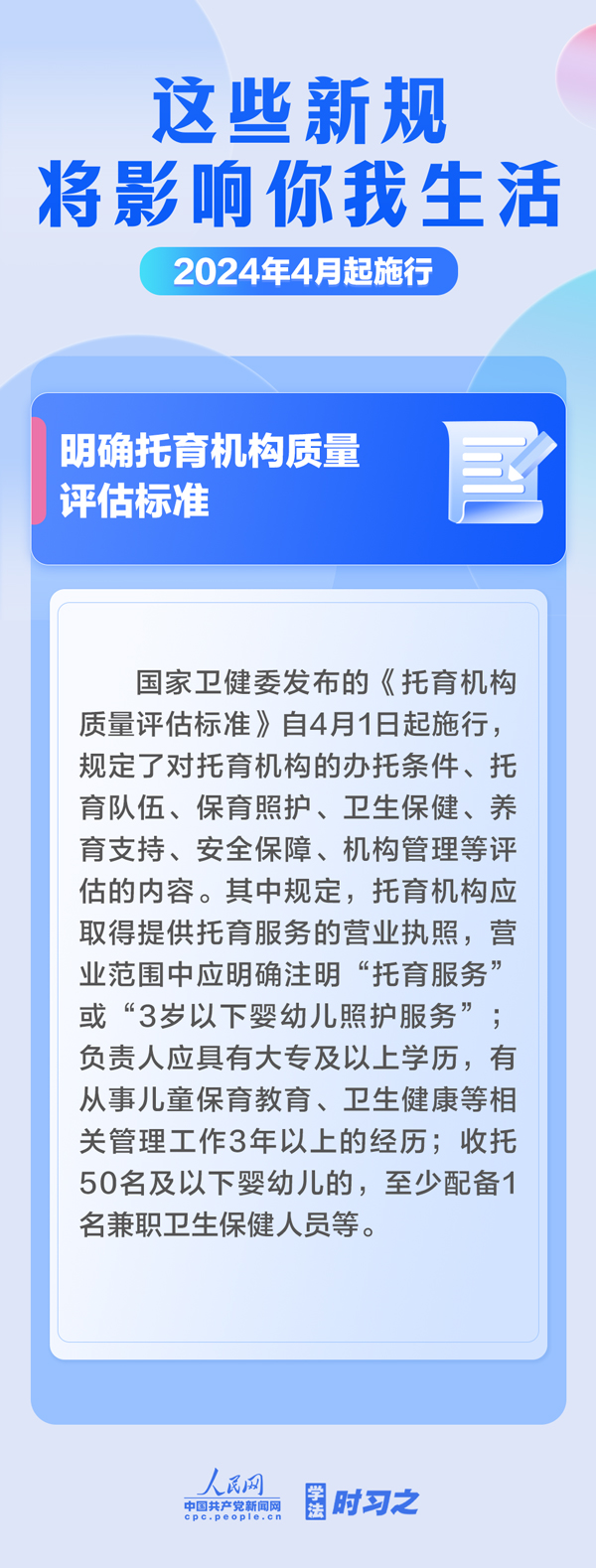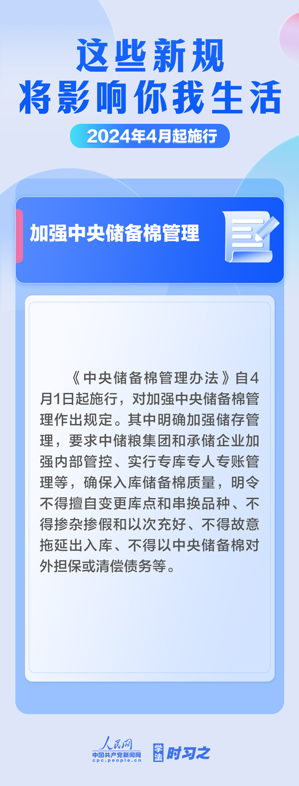 加強中央儲備棉管理;明確托育機構(gòu)質(zhì)量評估標(biāo)準(zhǔn);規(guī)范可再生能源電量收購……4月起,這些新規(guī)施行,將影響你我生活。(薄晨棣)