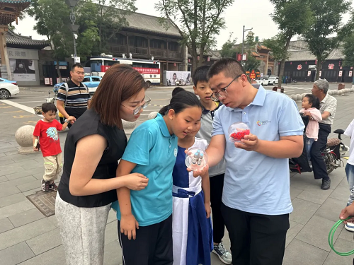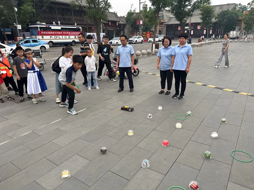 活動現(xiàn)場,在一個特殊的攤位上,由近到遠分別擺放著“冰毒”“海洛因”“搖頭丸”等各種眼花繚亂的毒品仿真模型?!皝韥韥恚哌^路過不要錯過!”“瞧一瞧,看一看!”禁毒社工在“攤位”前賣力吆喝著,一陣陣吆喝聲引來了眾多游客,游戲通過套圈的方式,組織游客套中現(xiàn)場的毒品模型并準確說出毒品名稱即可獲得扇子、手機支架、帆布包等獎勵。