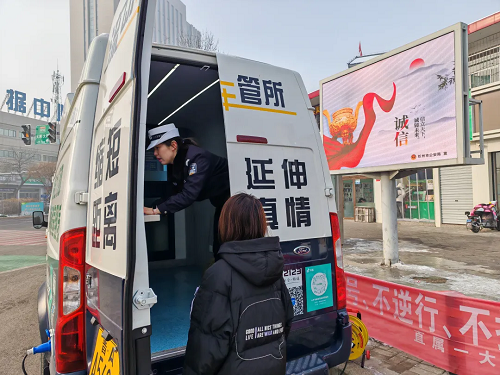 春節(jié)假期,城市、鄉(xiāng)村到處都彌漫著歡樂祥和的氣氛,初一至初七,在山西省忻州市忻府區(qū)光明西街古城北廣場、公園西街世紀花苑小區(qū)南門等人流量大、人員集中場所,忻州市公安局交警支隊的警郵車管便民服務(wù)車格外顯眼。“縮短距離、延伸真情”,這輛承載著為駕駛?cè)颂峁崆橹艿椒?wù)、為車輛安全出行提供保障,被群眾稱為“流動車管所”的車管便民服務(wù)車讓寒冬暖流涌動。