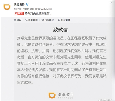 8月29日晚間,滴滴發(fā)出道歉信稱,“官方微博、官方微信的文章未經(jīng)劉翔同意,使用劉翔賽場上照片用于滴滴品牌宣傳推廣,這一行為給劉翔本人造成諸多誤解,在第一時(shí)間刪除了含有劉翔先生肖像的所有侵權(quán)鏈接,對(duì)于此次侵權(quán)行為,我們表示最誠摯的歉意?!?/p>
