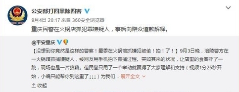 近日,一則警方在餐館內(nèi)抓捕犯罪嫌疑人的視頻在網(wǎng)上流傳。視頻顯示,在激烈的抓捕行動結(jié)束后,一名身著便衣的人向餐館內(nèi)所有客人示意并道歉,贏得現(xiàn)場喝彩。視頻被發(fā)布到網(wǎng)絡(luò)后獲得大量網(wǎng)友點贊,公安部官方微博也轉(zhuǎn)發(fā)了該視頻。