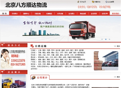 由于時間緊急,平常聯(lián)絡的物流公司暫時沒車,配送不了。當天,該公司的行政人員從網(wǎng)絡上搜索武漢到北京的物流專線,發(fā)現(xiàn)一家名為“八方順達物流”的公司,紅色主頁的網(wǎng)站上,顯示有客服電話、物流、接單、登記、調用安排、在途追蹤等具體信息。