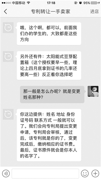 有聲稱(chēng)可以辦理專(zhuān)利的賣(mài)家在貼吧上發(fā)布廣告稱(chēng),“申請(qǐng)實(shí)用新型專(zhuān)利,參加自主招生必備”,并表示“你擁有了專(zhuān)利,就比別人領(lǐng)先了一步”。