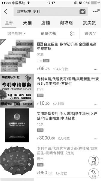 市場(chǎng)需求使得部分專(zhuān)利代理公司打起了高中學(xué)生群體的主意。北青報(bào)記者在淘寶網(wǎng)上以“自主招生專(zhuān)利”為關(guān)鍵詞進(jìn)行搜索,發(fā)現(xiàn)有多家知識(shí)產(chǎn)權(quán)服務(wù)機(jī)構(gòu)的網(wǎng)店寫(xiě)明可以提供“專(zhuān)利申請(qǐng)”、“專(zhuān)利轉(zhuǎn)讓”等服務(wù),并注明專(zhuān)利是“自主招生考試通行證”。