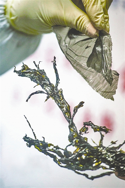 福建省水產(chǎn)加工流通協(xié)會(huì)的報(bào)告稱(chēng),受謠言的影響,該省紫菜產(chǎn)業(yè)保守估計(jì)損失將達(dá)到數(shù)千萬(wàn)元甚至上億元。為澄清傳聞,北京、福建、廣東等地近日對(duì)市場(chǎng)上的紫菜進(jìn)行了檢查或?qū)嶒?yàn)室鑒定。圖為廣州CEC食品安全檢測(cè)中心,對(duì)比干的紫菜和薄塑料袋。