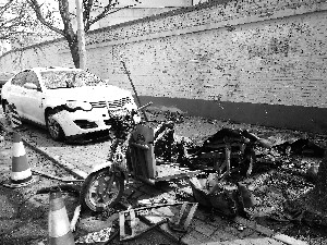 昨日,北京晨報記者來到酒仙橋二街坊附近,在1號樓樓下聚著一群人,正在討論凌晨爆炸的事情,“簡直就是個移動隱患”,“還好不是白天,不然肯定有人受傷”。記者看到,一輛綠色三輪車嚴(yán)重損毀,車輪扭曲倒在地上,車身部分被炸成了一張橫鋪著的大鐵皮,經(jīng)過灼燒后變得焦黑。三輪車的部分零件丟失,旁邊的樹上掛著鐵條,十幾米外的墻邊散落著三輪車的架子,而車輛原本放置電瓶的地方空無一物。在三輪車旁,一個大煤氣罐被炸成三部分,中間圓筒狀變成一塊鋪展后約1平方米的厚鐵皮,上下兩端則變成兩個圓形的蓋子(如圖)。