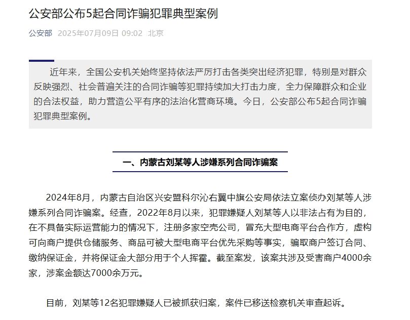 2024年8月,內(nèi)蒙古自治區(qū)興安盟科爾沁右翼中旗公安局依法立案偵辦劉某等人涉嫌系列合同詐騙案。經(jīng)查,2022年8月以來,犯罪嫌疑人劉某等人以非法占有為目的,在不具備實際運營能力的情況下,注冊多家空殼公司,冒充大型電商平臺合作方,虛構(gòu)可向商戶提供倉儲服務(wù)、商品可被大型電商平臺優(yōu)先采購等事實,騙取商戶簽訂合同、繳納保證金,并將保證金大部分用于個人揮霍。截至案發(fā),該案共涉及受害商戶4000余家,涉案金額達(dá)7000余萬元。