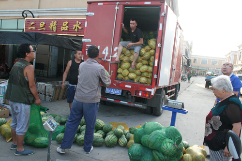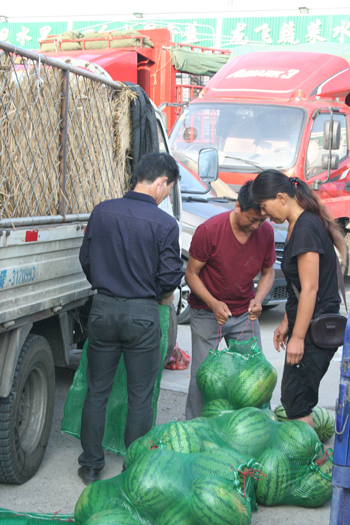 暑期天氣赤日炎炎,8月7日,原平市德金集貿(mào)瓜果蔬菜市場(chǎng)大西瓜貨豐價(jià)穩(wěn)購(gòu)銷兩旺,市民們紛紛購(gòu)買防暑解熱。(趙春曉 攝)