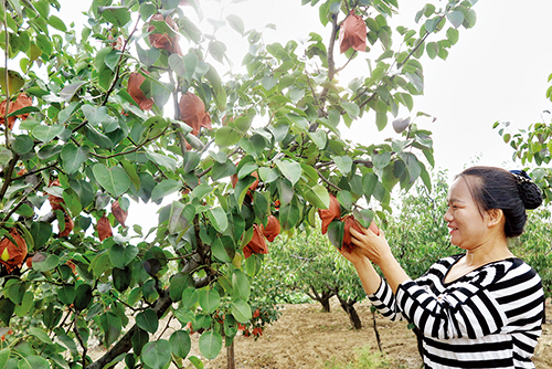 走進(jìn)梨園,記者看到,一排排梨樹枝粗葉茂,大大小小的套袋酥梨掛滿了枝頭,等待著人們的采摘?!耙郧熬褪敲考矣心敲磶卓脴洌懔闵⑸⒉怀蓺夂颉,F(xiàn)在形成了規(guī)?;N植,在市場(chǎng)上也打出了品牌。”王紅麗指了指周邊一眼看不到盡頭的梨園,介紹說這都是同村的村民種植的。為了符合人們現(xiàn)在純天然、綠色、無污染的消費(fèi)需求,所有的梨在剛成形時(shí)就被套上了袋子,不再打農(nóng)藥?!艾F(xiàn)在各家各戶都開始采摘了,再過幾天,就會(huì)有各地來的經(jīng)銷商統(tǒng)一收購(gòu)。”