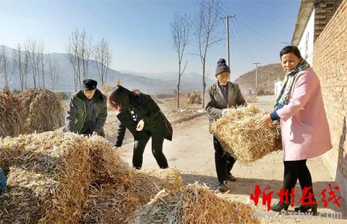“各精準(zhǔn)扶貧戶,現(xiàn)在到村委會(huì)院內(nèi)給羊領(lǐng)取草料,快些??!”12月10日上午,岢嵐縣嵐漪鎮(zhèn)石家會(huì)村的大喇叭上不斷傳來廣播,村民們奔走相告,在村的精準(zhǔn)扶貧對(duì)象紛紛來到村委會(huì)院內(nèi)。頓時(shí),村委會(huì)院內(nèi)像過年一樣熱鬧,拉草料的大車已經(jīng)停了一溜,每輛車上都是50斤一捆的草料,臺(tái)階上擺著整齊的桃心圖案的漆布、嶄新的鍋蓋、床單,第一書記楊英正在跑前跑后招呼著老鄉(xiāng)們前來領(lǐng)取物品、簽字。