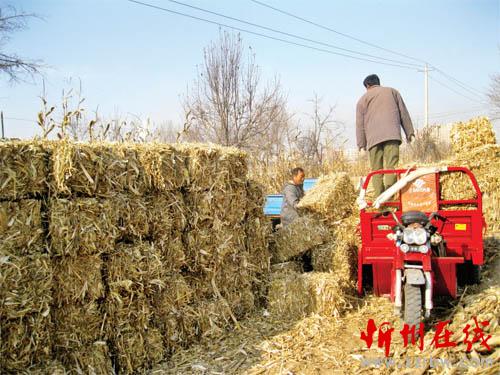 河曲縣南元村3 戶農(nóng)民購(gòu)置秸稈打捆機(jī),利用冬閑時(shí)間幫助村民處理田間玉米秸稈,將其作為飼草銷售,既增加收入,又避免了因焚燒秸稈造成大氣污染,對(duì)保護(hù)環(huán)境起到了積極作用。圖為1 月18 日他們正將秸稈捆裝車,然后運(yùn)到存放場(chǎng)所碼垛。(賈金理 攝)