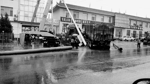 當天夜里,五臺縣東冶鎮(zhèn)遭遇持續(xù)強降水天氣過程,公司調(diào)控中心值班員在凌晨3時22分發(fā)現(xiàn)10千伏829北大街線速斷掉閘,立刻電話通知所管轄區(qū)東冶供電所。得知情況后,該供電所組織搶修人員迅速趕往事故現(xiàn)場,勘查電桿及線路受損情況。經(jīng)查勘,原來是一輛重型載貨卡車在駛經(jīng)五臺縣東冶鎮(zhèn)時,因連夜大雨導致路面濕滑把一基電桿給撞倒了,斷裂的電桿壓在大卡車上,大卡車無法行駛。這一意外事件,造成了10千伏北大街線失電、沿線居民用電中斷。10千伏829北大街線是東冶鎮(zhèn)街道主要干線,生產(chǎn)任務繁重,能否盡快恢復送電直接關乎沿線居民的切身利益。