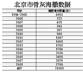 目前,以骨灰海葬、骨灰自然葬為代表的節(jié)地生態(tài)葬式已成為北京市骨灰安葬的主流。本市骨灰海葬活動自1994年實(shí)施以來,迄今已順利組織了485次,播撒骨灰21666份,服務(wù)逝者家屬67887人次,僅2018年就組織骨灰撒?;顒?0批次,播撒骨灰2760份,參加活動家屬11160人,在全國居于領(lǐng)先地位?!笆濉蹦腔液T崃款A(yù)計(jì)將達(dá)到北京市年火化總量的4%。