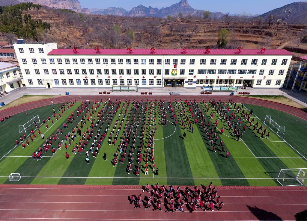 ↑這是學(xué)生們在做足球操(4月15日無人機(jī)拍攝)。新華社記者詹彥攝