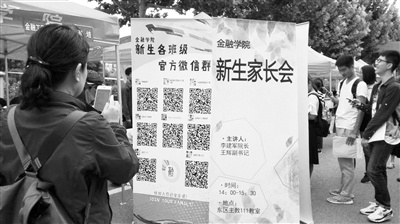 9月1日,中央財經大學新生報到現場,金融學院的學生邀請新生掃碼入群。李涓 攝
