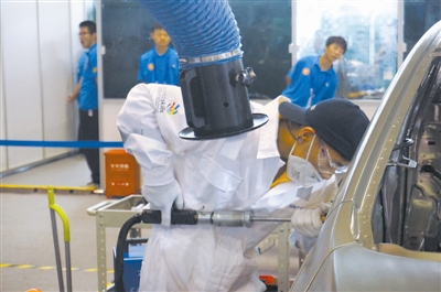 圖為世界技能大賽全國選拔賽汽車修理項目的比賽現(xiàn)場,一名參賽選手正在檢查車身。
