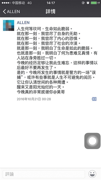 事后,被錯抓的大學(xué)生黃誠發(fā)朋友圈感慨“嘗盡恐懼”。