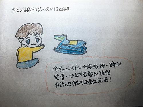 漫畫中,媽媽抱著襁褓里的嬰兒傷心地哭泣著,這是焦洋畫的漫畫中的一幅,是最揪心的一幅漫畫。旁邊配著焦洋用中性筆工工整整寫的大片文字?!耙?yàn)榍闆r危急,媽媽早產(chǎn)一個(gè)月,你出生就要和媽媽分開,你被送去另一個(gè)醫(yī)院……媽媽每天祈禱,盼著你快快出院,終于在半個(gè)月后把你從醫(yī)院抱回來,那是媽媽第一次抱你,看著你個(gè)小人兒從此與我息息相關(guān)。仿佛那一瞬間明白了責(zé)任是什么,謝謝你寶貝,讓我邁入人生的另一個(gè)階段?!?br /> 焦洋今年33歲,在8年前,她生下兒子派派。孩子的出生并不順利,早產(chǎn)了一個(gè)月,因?yàn)槿毖?,醫(yī)生甚至都建議家人放棄這條小生命。可是焦洋堅(jiān)決不放棄,只要有一絲希望就得拼盡全力?!爸宦牭揭宦暱奁缶捅会t(yī)生抱走,放進(jìn)保溫箱,我都沒看到他的模樣,讓我放棄,絕對(duì)不會(huì)同意的?!苯寡笳f,因?yàn)楹⒆右怀錾臓顩r非常糟糕,她只好獨(dú)自出院,留下還在保溫箱里的孩子。