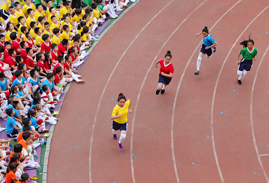 2019年6月6日,河北秦皇島,海港區(qū)新一路小學(xué)學(xué)生在全國學(xué)校體育聯(lián)盟(教學(xué)改革)海港區(qū)實驗校階段性成果展示活動中表演趣味比賽項目。視覺中國供圖