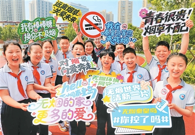 第38個(gè)“世界無(wú)煙日”到來(lái)之際,河北省秦皇島市疾控中心(市衛(wèi)生監(jiān)督所)工作人員走進(jìn)秦皇島市第七中學(xué)玉龍灣校區(qū),為學(xué)生普及吸煙有害健康的相關(guān)知識(shí)。圖為工作人員和學(xué)生共同和禁煙標(biāo)識(shí)、標(biāo)語(yǔ)合影。曹建雄攝(人民視覺)