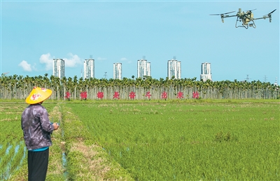 7月6日,海南省瓊海市嘉積鎮(zhèn)農(nóng)民在利用無(wú)人機(jī)噴灑農(nóng)藥。蒙鐘德攝(人民視覺)