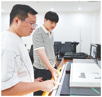 實驗室內(nèi),張展(左)正在和學(xué)生掃描錄入甲骨文拓本?;魜喥綌z