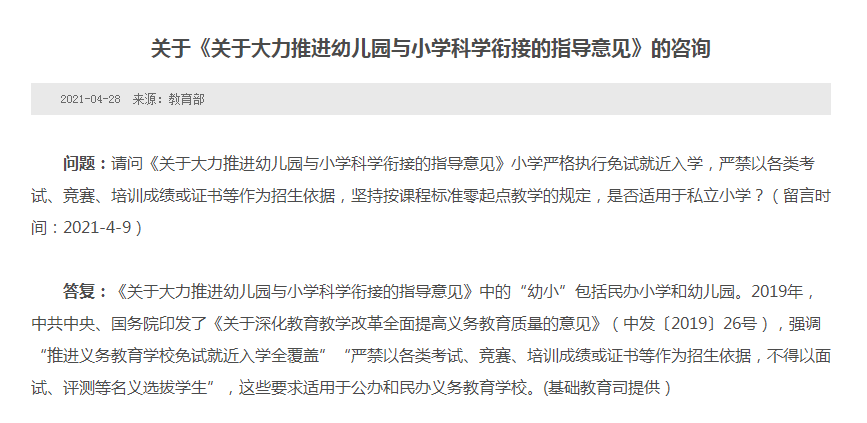 新華網(wǎng)北京4月28日電 近日,教育部在回應(yīng)網(wǎng)友咨詢《關(guān)于大力推進(jìn)幼兒園與小學(xué)科學(xué)銜接的指導(dǎo)意見》相關(guān)問題時表示,該指導(dǎo)意見中的“幼小”包括民辦小學(xué)和幼兒園。2019年,中共中央、國務(wù)院印發(fā)了《關(guān)于深化教育教學(xué)改革全面提高義務(wù)教育質(zhì)量的意見》(中發(fā)〔2019〕26號),強(qiáng)調(diào)“推進(jìn)義務(wù)教育學(xué)校免試就近入學(xué)全覆蓋”“嚴(yán)禁以各類考試、競賽、培訓(xùn)成績或證書等作為招生依據(jù),不得以面試、評測等名義選拔學(xué)生”,這些要求適用于公辦和民辦義務(wù)教育學(xué)校。