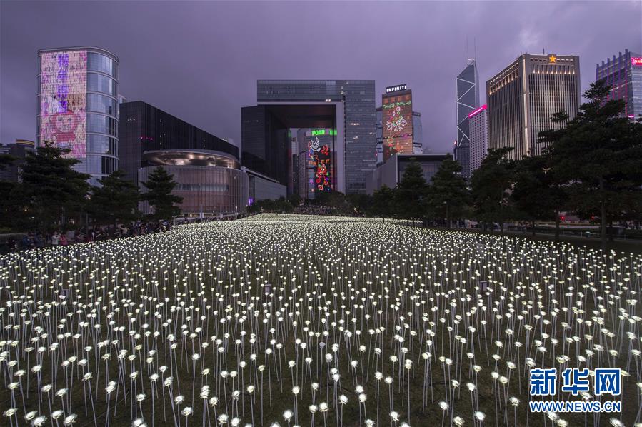 這是在中環(huán)海濱拍攝的白玫瑰花燈(2月13日攝)。 2月13日,來自韓國首爾的LED Rose Garden大型公共展覽亮相香港。25000朵LED白玫瑰花燈在中環(huán)海濱展出,在情人節(jié)即將到來之際點亮維港,營造出浪漫甜蜜的氛圍。新華社記者 呂小煒 攝