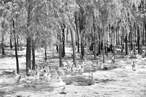林下覓食的雞群