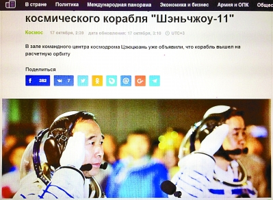 十月十七日,俄羅斯塔斯社網(wǎng)站第一時間發(fā)布的題為《中國成功發(fā)射神舟十一號載人飛船》的報道。本報駐莫斯科記者 汪嘉波攝/光明圖片