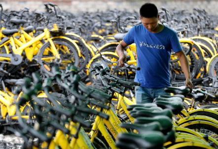 在杭州中諸葛路,4萬輛回收的ofo單車停放在場地上。 視覺中國