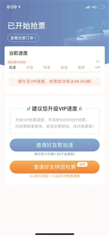 相比祝先生的贊,王女士感覺像是搶票軟件設(shè)置的噱頭,讓大家分享朋友圈給軟件做宣傳,她先后多次讓朋友為自己加速,感覺都要“飛起來了”,也沒搶到自己想要的車票。同時,上海的肖先生表示,自己多次使用該軟件后發(fā)現(xiàn),“加錢或不加錢,只是在界面上顯示搶到票的概率數(shù)字會增加,其實并沒有感到有什么區(qū)別?!?/p>