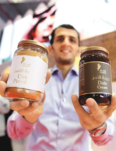 11月7日,第二屆進(jìn)博會(huì)沙特阿拉伯國家館工作人員在展示產(chǎn)自沙特的果醬。新華社記者 陳 飛攝