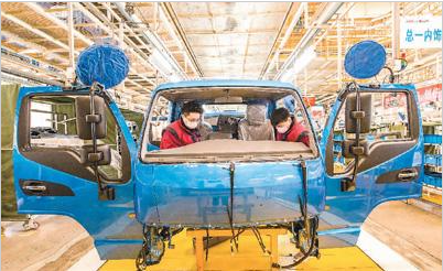 2月11日,在山東省青州市一家汽車制造企業(yè)生產(chǎn)車間內(nèi),工人正在組裝生產(chǎn)輕型卡車。 王繼林?jǐn)z(人民視覺(jué))