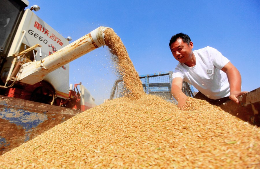 山東省臨沂市平邑縣地方鎮(zhèn)農(nóng)民將收獲的小麥裝車(chē)(6月13日攝)。(新華社發(fā),武紀(jì)全攝)