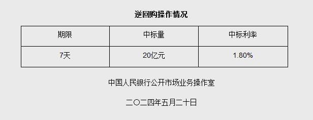 中新網(wǎng)5月20日電 據(jù)中國(guó)人民銀行網(wǎng)站消息,為維護(hù)銀行體系流動(dòng)性合理充裕,2024年5月20日人民銀行以利率招標(biāo)方式開展了20億元逆回購(gòu)操作。具體情況如下: