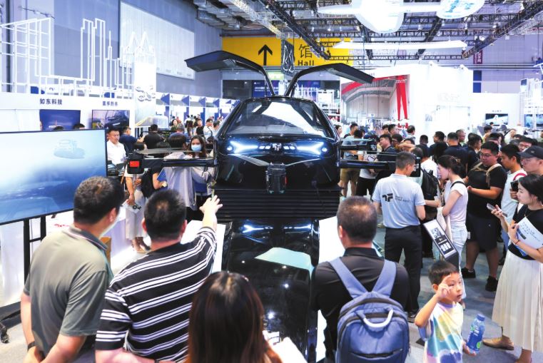 7月23日,觀眾在博覽會(huì)現(xiàn)場(chǎng)了解一款飛行汽車。