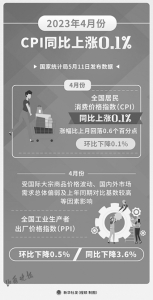 據(jù)新華社電 國家統(tǒng)計局11日發(fā)布數(shù)據(jù),4月份,全國居民消費(fèi)價格指數(shù)(CPI)同比上漲0.1%,漲幅比上月回落0.6個百分點。