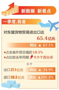 我省對東盟進(jìn)出口主要呈現(xiàn)以下特點(diǎn):從國別看,一季度我省對東盟10國進(jìn)出口值中,印度尼西亞居首位,進(jìn)出口32.9億元,占全省對東盟進(jìn)出口值的50.3%;其次為新加坡,進(jìn)出口13.5億元,占全省對東盟進(jìn)出口值的20.7%;對東盟10國的進(jìn)出口中有7國實(shí)現(xiàn)增長,其中對印度尼西亞和緬甸實(shí)現(xiàn)成倍增長。我省對東盟出口機(jī)電產(chǎn)品19億元,同比增長50.2%,占全省對東盟出口值的69.8%。主要進(jìn)口商品中,鐵合金出現(xiàn)大幅增長,各類金屬礦及礦砂量減值增,我省自東盟進(jìn)口鐵合金11.5萬噸、貨值18.9億元,分別增加14.4倍和增長10.2倍,占全省自東盟進(jìn)口值的49.3%,全部來自印度尼西亞;進(jìn)口各類金屬礦及礦砂29.6萬噸,貨值5.8億元。