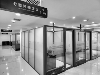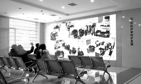 參觀完一層大廳后,工作人員將媒體觀摩團帶到了四層一個全封閉的區(qū)域——評標(biāo)區(qū),隨機抽取的專家會在這里進行評標(biāo)工作。代表們首先是被一系列的科技防范“硬措施”所震撼,人臉識別身份核驗機、金屬探測門防范冒名頂替,通信設(shè)備存儲柜、文件傳送智能機器人阻斷不必要的溝通,軌跡定位卡、電子呼叫系統(tǒng)、電子門牌等技術(shù)的應(yīng)用實現(xiàn)了對交易人員身份類別權(quán)限的精準(zhǔn)管控……還有全方位、超高清、永久保存的監(jiān)控設(shè)備,實時對外直播的電子大屏,實現(xiàn)了嚴(yán)密管控、處處震懾。