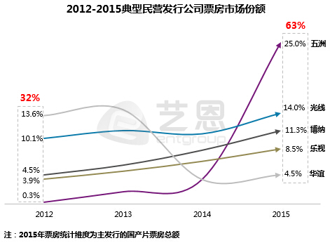 根據(jù)藝恩研究報告顯示,華誼兄弟從2012年的13.6%的市場份額一路跌至2015年的4.5%,而由萬達(dá)影視牽頭的五洲發(fā)行市場份額一路從0.3%飆升至25%,華誼的電影份額被一路碾壓。而萬達(dá)影視也即將以注入上市公司的方式登陸A股市場。