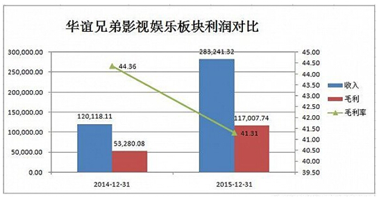 據(jù)界面報道,根據(jù)財報顯示,華誼兄弟2015年影視娛樂版塊營業(yè)收入較上年同期相比增135.80%,達(dá)到28.32億元,營業(yè)成本較上年同期增長135.80%,達(dá)到16.62億,毛利率較上年減少了3.05%,達(dá)到41.35%。在報告期內(nèi),公司上映的主要是《奔跑吧兄弟》《天將雄師》《梔子花開》、《命中注定》《尋龍訣》《老炮兒》等16部,電影的總票房約43億。
