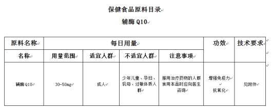2019年3月,國(guó)家市場(chǎng)監(jiān)管總局發(fā)布《關(guān)于公開征求輔酶Q10等5種保健食品原料目錄意見的公告》,將輔酶Q10功效進(jìn)一步收窄為兩點(diǎn):增強(qiáng)免疫力和抗氧化