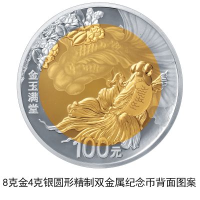 8克金4克銀圓形雙金屬紀念幣背面圖案為金魚與海棠花等組合圖案,并刊“金玉滿堂”字樣及面額。