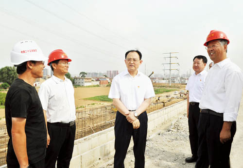 在忻州西站以北的大西客專與忻五公路交叉地段,京太鐵路(雄忻段)引入大西客專施工現(xiàn)場,李俊明詳細了解大西客專既有線路、雄忻高鐵接軌的近期工程和預留遠期規(guī)劃,實地察看左右進出線的路基打樁、擋墻施工、路基幫寬等正在進行的工程,聽取各主要節(jié)點工期計劃安排,詢問工程實施中的困難問題。