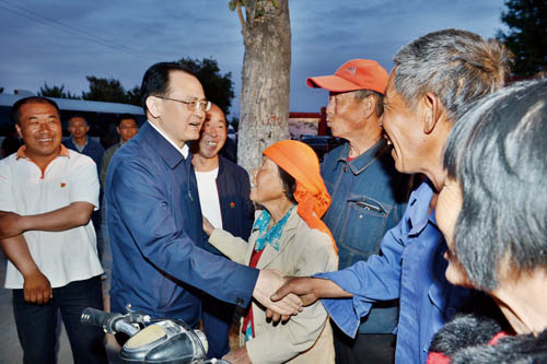 圖為省人大常委會(huì)副主任、市委書記李俊明在偏關(guān)縣高家上石會(huì)村駐村時(shí)和街頭群眾共話脫貧增收大計(jì)。(本報(bào)記者 宮愛(ài)文 攝)