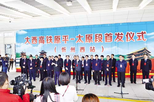 圖為大西高鐵原平至太原段首發(fā)儀式在忻州西站舉行,省人大常委會副主任、市委書記李俊明宣布高鐵開通并發(fā)出發(fā)車指令。本報(bào)記者 宮愛文 攝
