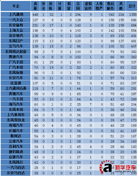 中消協(xié)2015汽車廠家被投訴具體數據排行榜(部分)