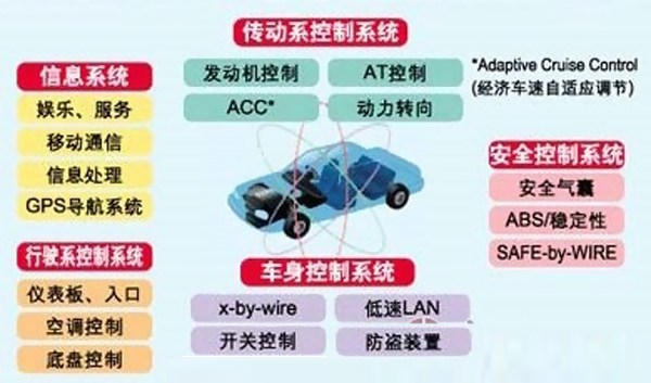 看看這張圖,你會理解電子系統對于每輛車的重要性,用傳感器、微處理器、執(zhí)行器、幾十甚至上百個電子元器件及其零部件組成的電控系統。